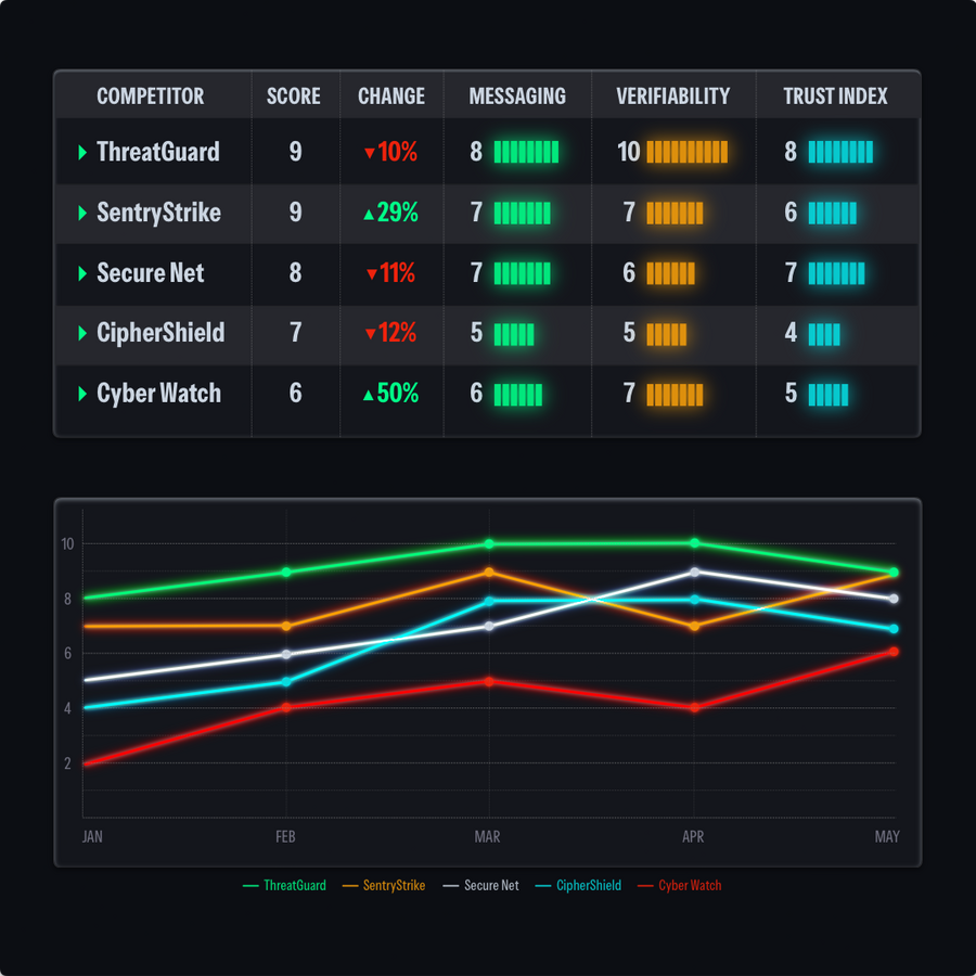 Brands make big promises — fastest, most secure, AI-powered.When everyone is saying the same, how can you trust they're different?Introducing the Trust Index™ — a proprietary score that tracks your competitor's marketing claims for credibility, evidence and trust, based on 5 factors: