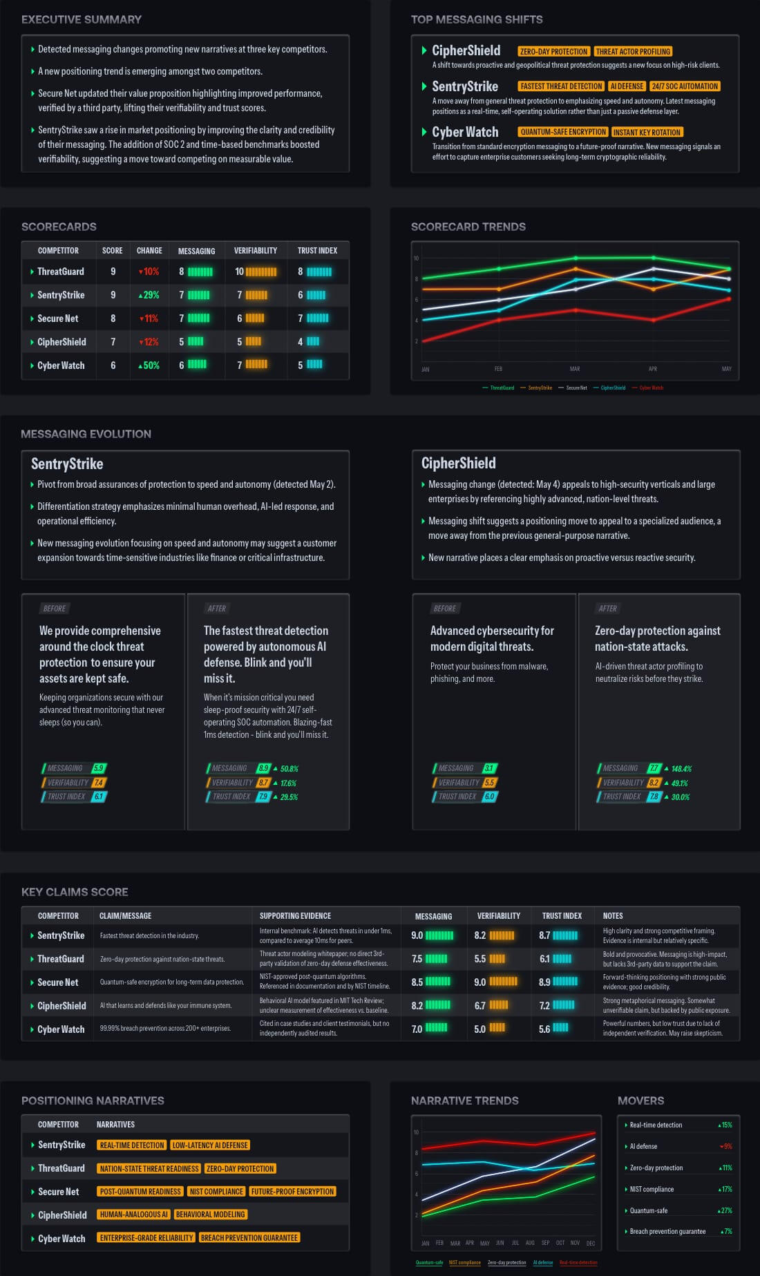 What kind of insights are included? Key messaging shifts, claim-by-claim breakdowns, trust, verifiability and messaging scores, positioning trendlines, before-and-after messaging comparisons, competitor scorecards and theme evolution.