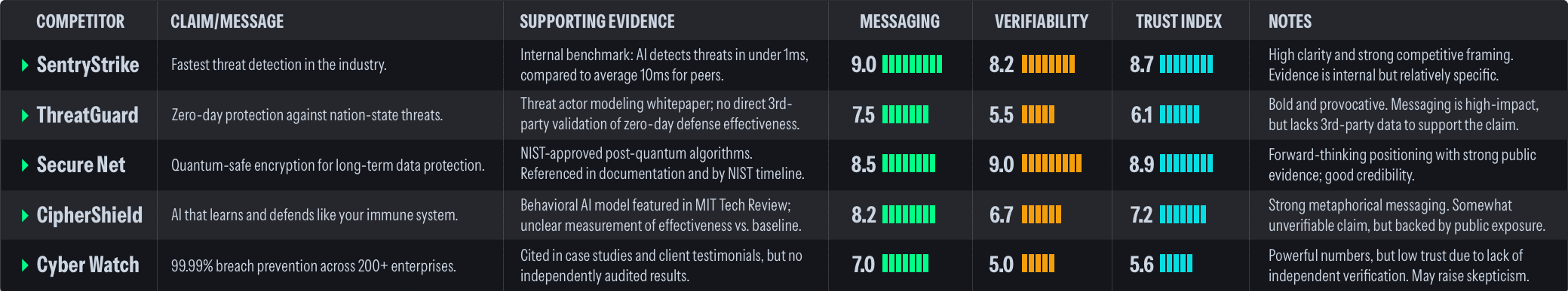 Brands make big promises — fastest, most secure, AI-powered.When everyone is saying the same, how can you trust they're different?Introducing the Trust Index™ — a proprietary score that tracks your competitor's marketing claims for credibility, evidence and trust, based on 5 factors: